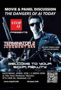 Join Stop AI for a viewing of 'Terminator 2: Judgement Day' where they will be contextualizing this cult classic in regards to our modern struggles against AI, and rallying ourselves to come together as a community to protect the future of humanity.